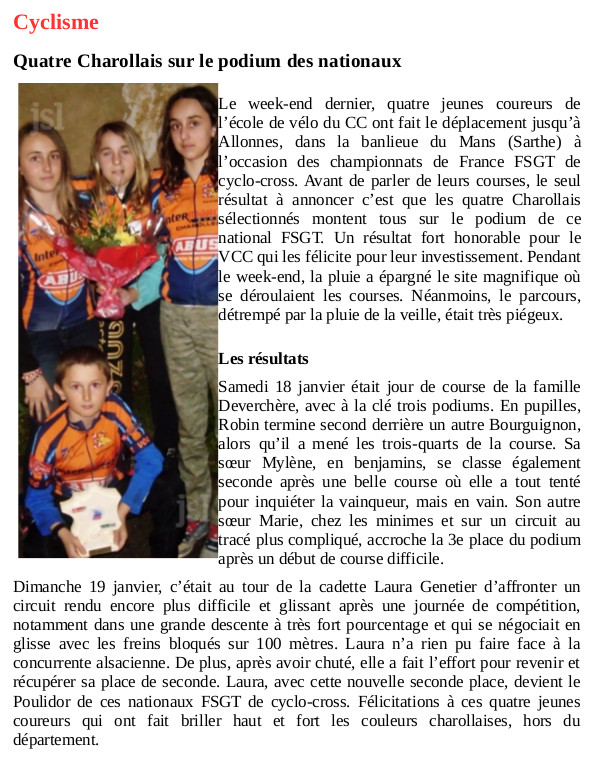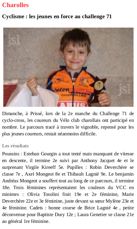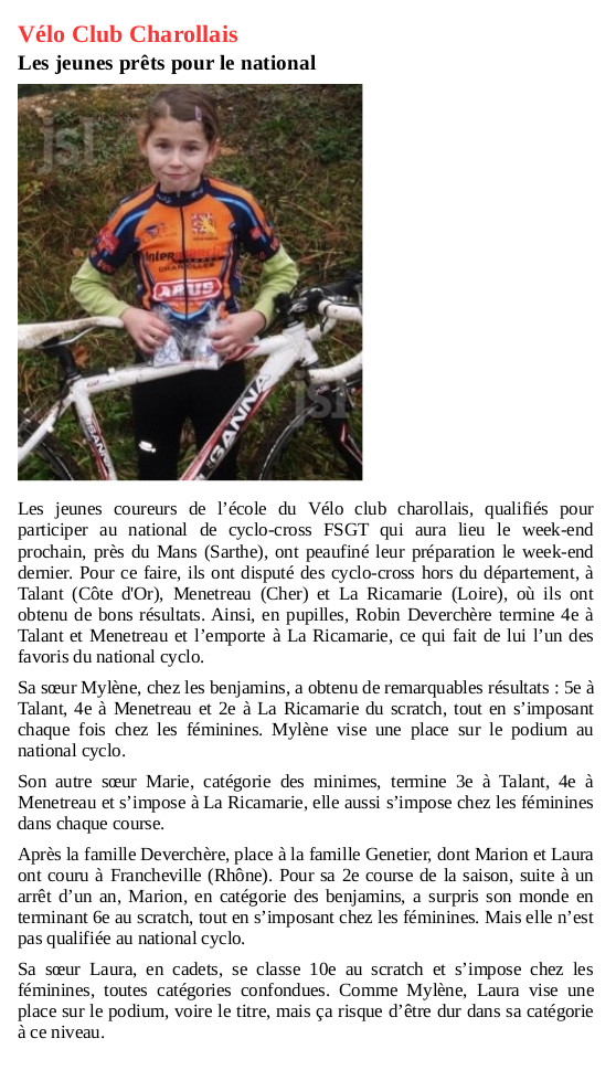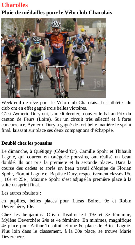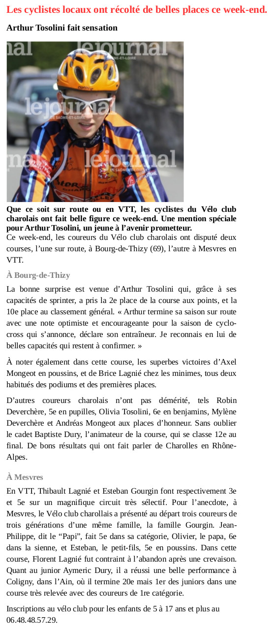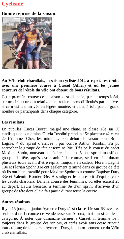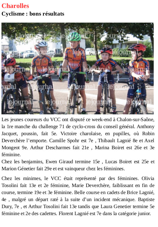 JSL : édition du 22 octobre 2014 : Cylisme : bons résultats