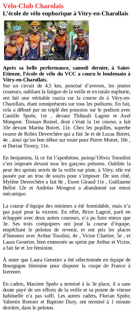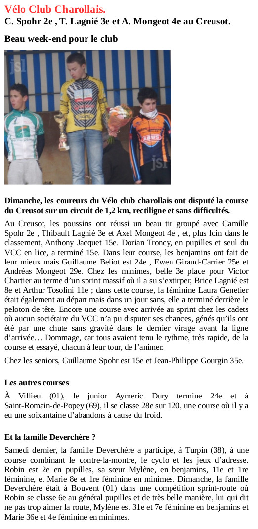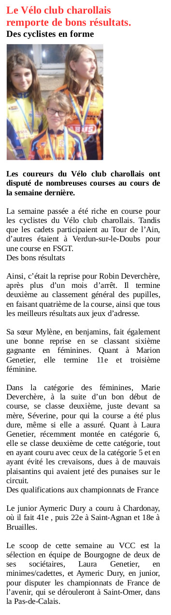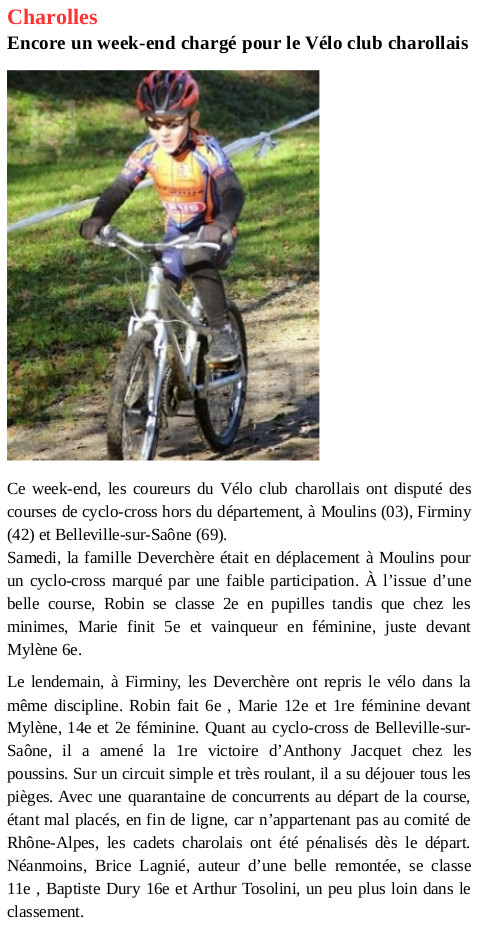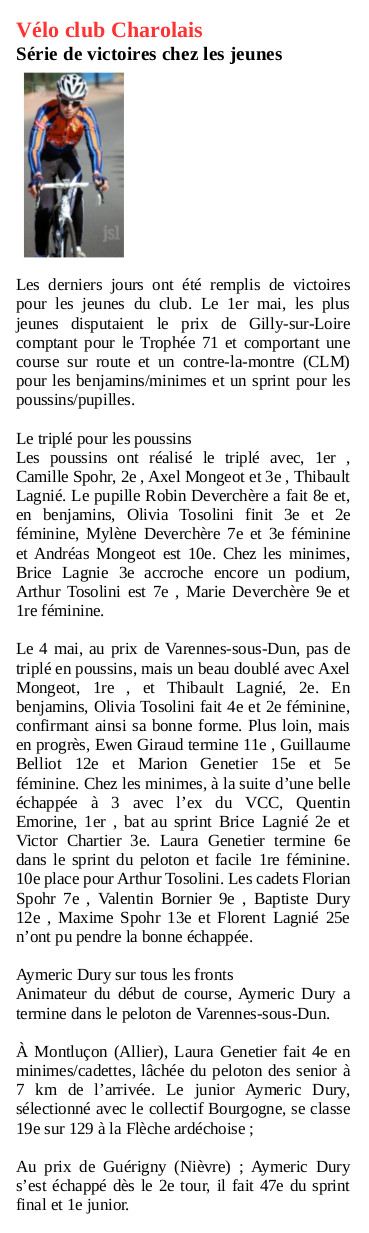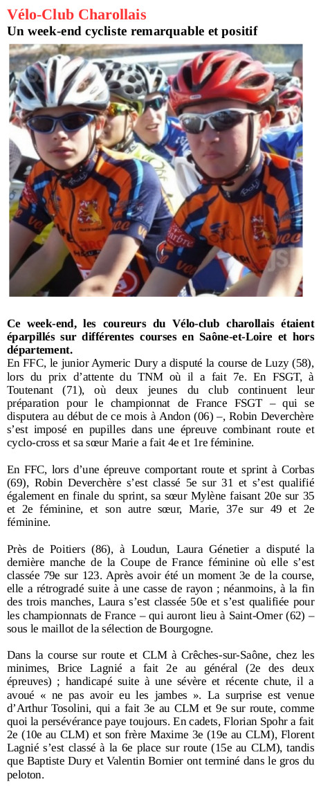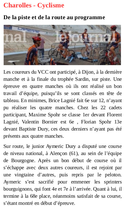 JSL : édition du 22 octobre 2014 : Cylisme : bons résultats
