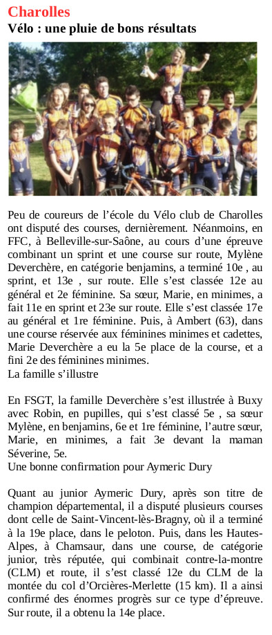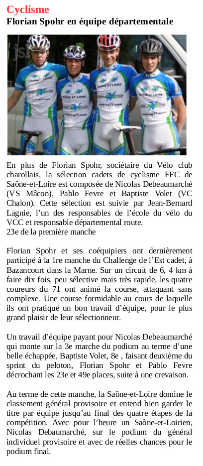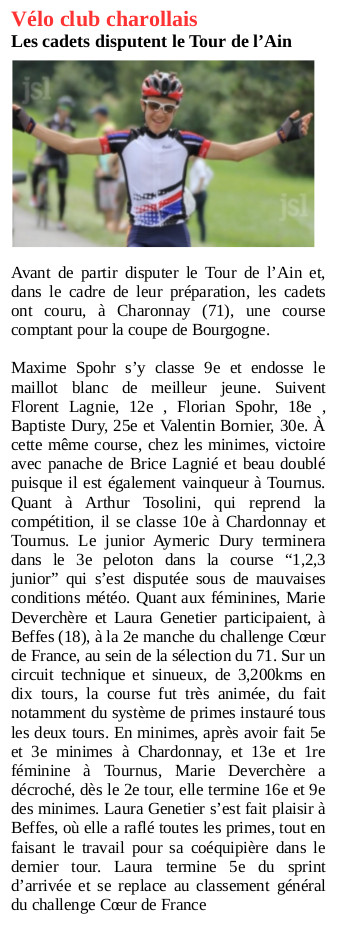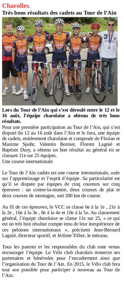 JSL : édition du 22 août 2014 : Très bons résultats des cadets au tour de l'Ain